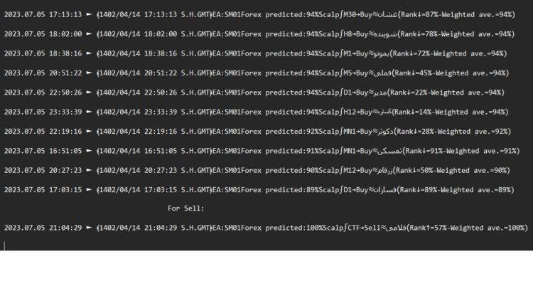 2023.07.05 21:04:29 ► ﴾1402/04/14 21:04:29 S.H.GMT﴿EA:SM01Forex predicted:100%Scalp∫CTF→Sell≈فلامی(Rank↑=57%-Weighted ave.=100%)