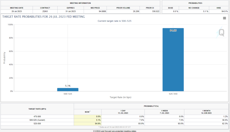 It would seem that the disinflation narrative has firmly gripped the Dollar given the selloff over the past few days. The FOMC meeting is on July 26 with the Fed currently in a blackout and not any significant data releases on the agenda ahead of the meeting the Dollar could face further selling pressure. Looking at CME FedWatch Tool below we can see market participants are still pricing in a 25bps hike at the July meeting.