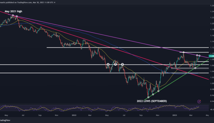 After this week’s climb, EUR/USD is currently facing a pivotal hurdle at 1.0930: a descending trendline in play since May 2021 that has acted as resistance multiple times over its lifespan. Price reaction at this technical juncture will be key, with a topside breakout setting the stage for a retest of the 2023 highs at 1.1033. On further strength, the focus shifts to the psychological 1.1200 handle.