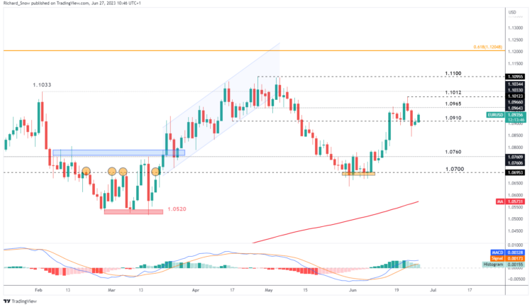 EUR/USD remains particularly sensitive to Fed and ECB comments after Jerome Powell’s hawkish testimony last week convinced markets to price in a greater probability of rate hikes in 2H, that ultimately saw the pair ease lower.