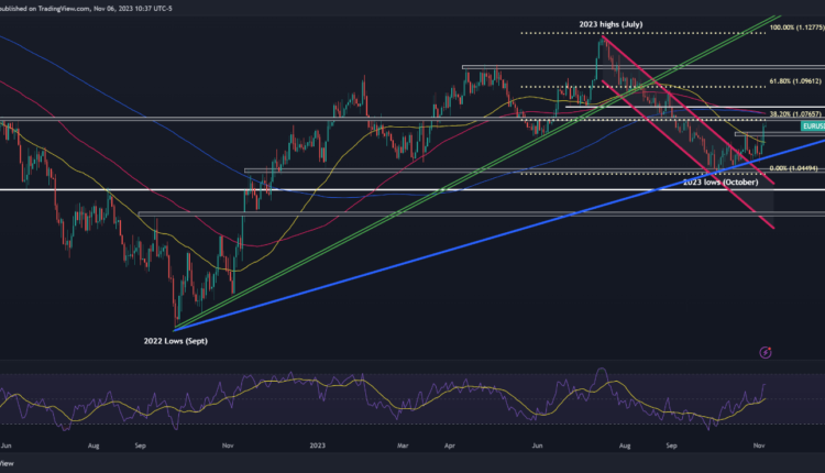 EUR/USD blasted higher last week following weaker-than-expected U.S. economic data, taking out a clear barrier in 1.0670/1.0695 area. Bullish momentum, however, faded on Monday, with the pair stalling after failing to clear technical resistance at 1.0765, which corresponds to the 38.2% Fibonacci retracement of the July/October pullback.