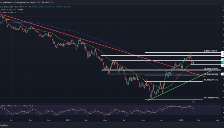 EUR/USD has been consolidating between resistance at 1.0785 and support at 1.0661 over the past few trading sessions. If prices resolve to the downside, we could see a retest of 1.0467 in the near term. In contrast, if consolidation resolves to the upside, the pair could climb toward 1.0942. On further strength, the focus shifts to the 2023 high.