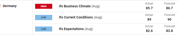 The latest German Ifo business sentiment report also underlines the weakness in Europe’s largest economy. All three indicators came in below last month’s release and missed market expectations.