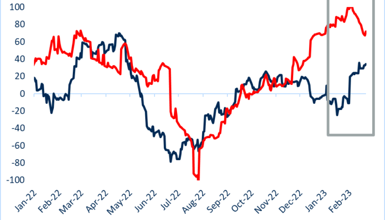 From a macro perspective, the story by and large so far this month has been surprisingly strong US data, as reflected in the jump in the US Economic Surprise Index to a 10-month high (see Economic Surprise Index chart). US Rate futures are now pricing in the Fed’s target rate to peak around 5.40% in September from the current 4.50-4.75%, compared with under 5% at the end of January.Key focus is now on US ISM Manufacturing and Services PMI data due Wednesday and Friday respectively.