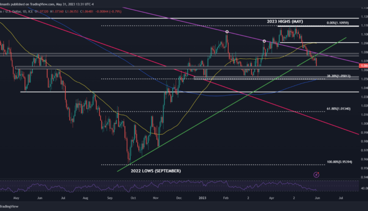 From a technical standpoint, EUR/USD has fallen sharply from its May highs, with the sell-off gathering pace following the invalidation of a medium-term rising trendline late last week, which saw prices breached dynamic support near 1.0750.