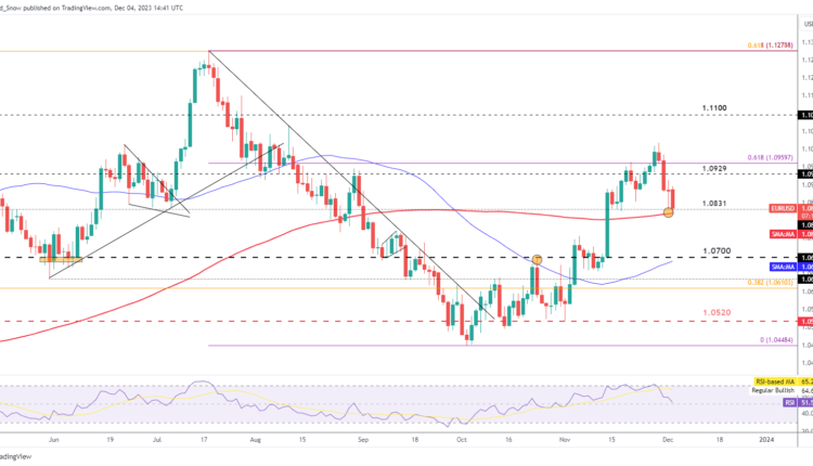 EUR/USD has traded lower since the swing high last week Wednesday and has approached a zone of support. The zone comprises of the 200-day simple moving average (SMA) and the 1.0831 level of support.