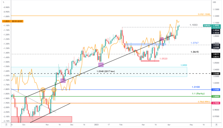 Today sees the start of the US bank earnings where credit loss provisions will be a key line item of interest. If banks are more pessimistic and anticipate an increase in defaults, this figure will rise. Apart from earnings, next week sees the March inflation data for the euro area, which is forecasted to print another rise. This becomes problematic as the ECB suggested core inflation will hover around 5% before dropping and we could see a print of 5.7% for March. Should the consensus hold, this would bode well for the current EUR/USD trend.