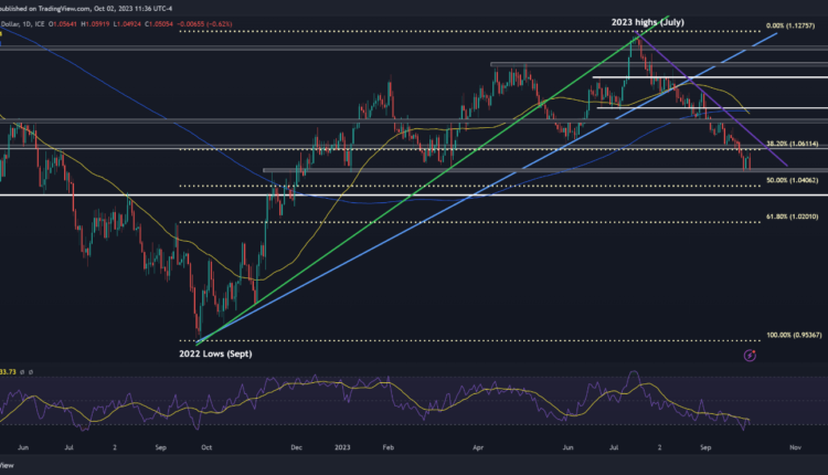 EUR/USD fell sharply on Monday, weighed by broad-based U.S. dollar strength amid soaring U.S. Treasury yields, with the 10-year note pushing above 4.65% and hovering near its highest level since 2007. In this context, the pair sank about 0.5% in early afternoon trading in New York, steadily approaching the 1.0500 psychological level, a key near-term support to keep an eye on.