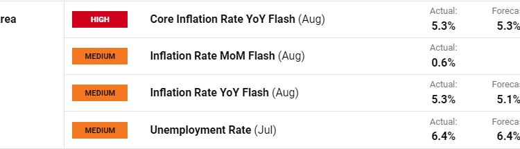 The YoY inflation rate held steady at 5.3% in August, according to a flash estimate from Eurostat, the statistical office of the European Union. Looking at the main components of euro area inflation, food, alcohol & tobacco is expected to have the highest annual rate in August (9.8%, compared with 10.8% in July), followed by services (5.5%, compared with 5.6% in July), non-energy industrial goods (4.8%, compared with 5.0% in July) and energy (-3.3%, compared with -6.1% in July).