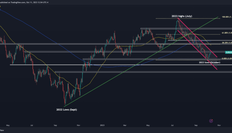 EUR/USD has rebounded in recent days after falling below the 1.0500 level and reaching its weakest point since December 2022 last week. In this context, the pair has recaptured the 1.0600 handle, moving ever closer to the channel resistance at 1.0615. The bulls may struggle to breach this barrier, but a clean breakout could pave the way for a rally towards 1.0765, the 38.2% Fibonacci of the July/October decline.