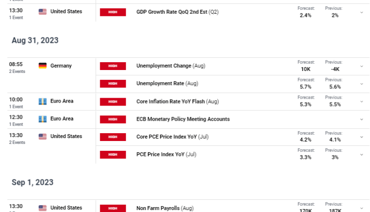 The Federal Reserve and the European Central Bank both reiterated their stance of keeping rates higher for as long as it takes at the Jackson Hole Symposium last week, leaving EUR/USD traders with little to work with. Fed chair Powell gave the market a very gentle dovish nod when he said that the central bank would ‘proceed carefully’ when assessing future policy moves, while President Lagarde said that while progress was being made, ‘the fight against inflation is not yet won’. Both central bank heads remain data-dependent and unless inflation begins to fall sharply, rates are set to be held at current levels in the coming months.