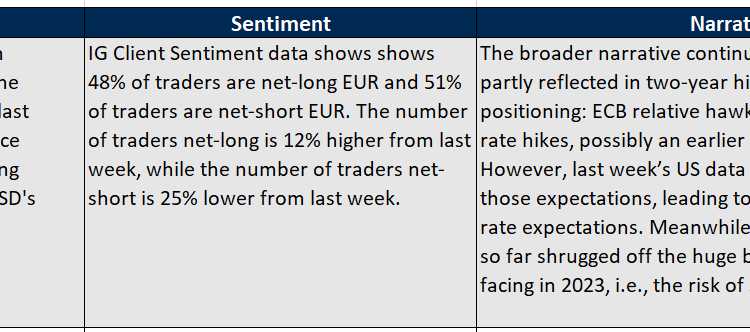 EUR/USD dropped after US jobs and services data beat expectations, leading to a repricing higher in US rate expectations. Rate futures now indicate the Fed to hike at least two more rate hikes, taking the benchmark to above 5%. Before Friday’s data, the market was expecting the benchmark rate to peak below 5%.