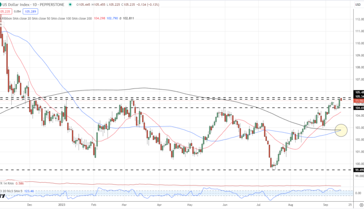 Next week, the Federal Reserve will announce its latest monetary policy decision with the Fed fully expected to leave interest rates unchanged at 525-550. The commentary at the Fed’s post-decision press conference however is not so easy to predict and may well spark a bout of US dollar volatility. If chair Powell points to the recent weakness in the jobs market, then the market may well decide that rates are at their terminal rate, while if Powell cites recent strong US economic data then markets may look for the US central bank to hike again later this year.