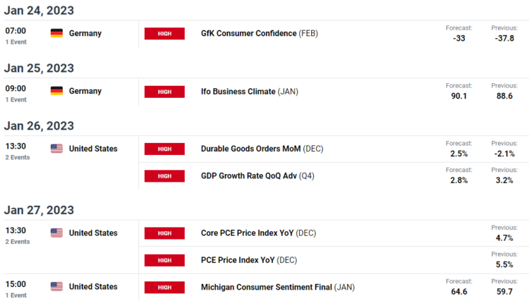 Next week’s economic calendar has a raft of high-importance releases that will affect both sides of EUR/USD. The latter half of the week looks the most likely to drive price action with the first look at US Q4 GDP, followed the next day by the Fed’s preferred measure of inflation, core PCE. If either of these releases misses or beats expectations then EUR/USD volatility will surge. In addition to these releases, the latest round of PMI data will be revealed on Tuesday (24th) next week and they should be closely followed.