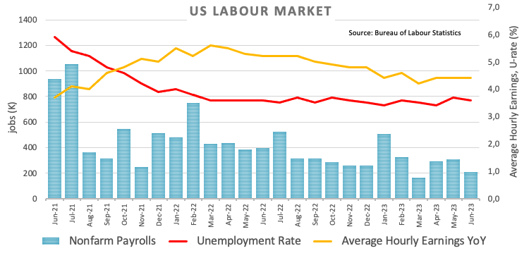Across the Atlantic, Nonfarm Payrolls showed the US economy added 209K jobs in June, while the Unemployment Rate eased to 3.6% in the same period. In addition, Average Hourly Earnings – a proxy for wage inflation – rose 0.4% MoM and 4.4% from a year earlier, and the Participation Rate held steady at 62.6%.