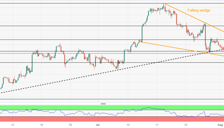 Following that, the 38.2% Fibonacci retracement of its May-July upside, near 1.1040, and the stated falling wedge’s top line, close to 1.1065, will be in the spotlight.