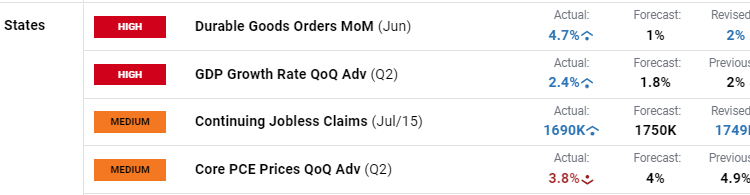 This week’s US data was dollar positive with advanced Q2 GDP seen at a robust growth rate o f2.4%, a strong durable goods reading of 4.7%, while jobs data also underscored the strength in the US labor market.
