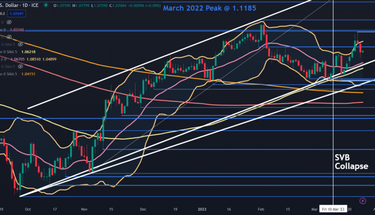 EUR/USD remains in an ascending trend channel after challenging the lower bound earlier this month ahead of the collapse of SVB Financial. An event that sent markets into a tailspin.