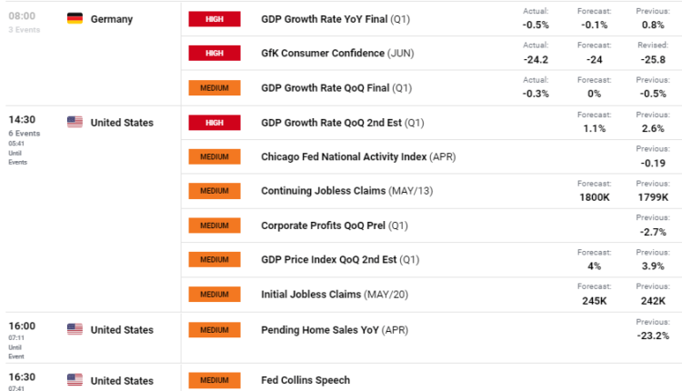 From a US perspective, US GDP is the only high impact event to come alongside the Fed’s Collins. Yesterday’s FOMC minutes didn’t help the situation for the euro with many officials either looking at a pause or another hike in the June meeting. That being said, moving forward the door is open for additional rate hikes should the need arise. This gives more significance to key US economic data including today’s GDP and tomorrow’s core PCE price index, durable goods orders and Michigan consumer sentiment.