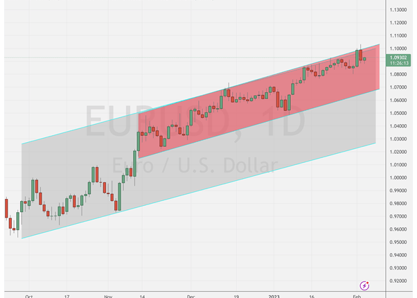 The broad uptrend channel from September 2022 is facing a clear and sustained upside test, with the market having broken above it intraday on both Wednesday and Thursday of this week.