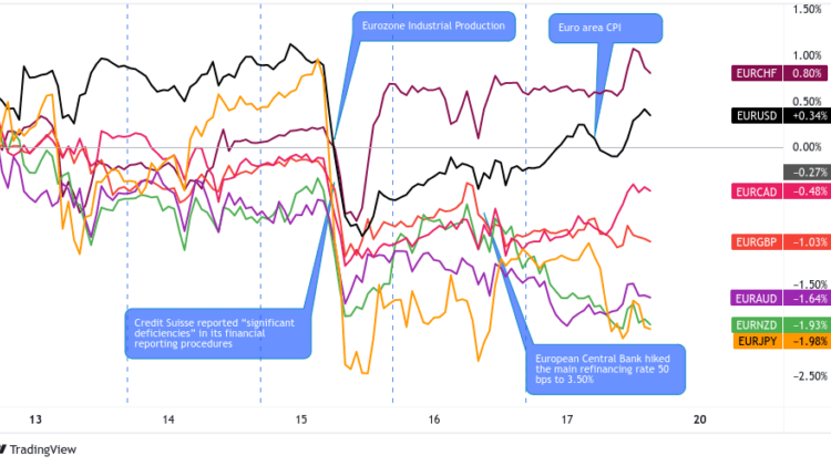 Risk environment and Intermarket behaviors: Concerns over Credit Suisse peaked days before the ECB’s decision, so assurances that the euro area’s banking sector is “resilient” and that the ECB has the tools ready to deploy helped calm banking jitters.