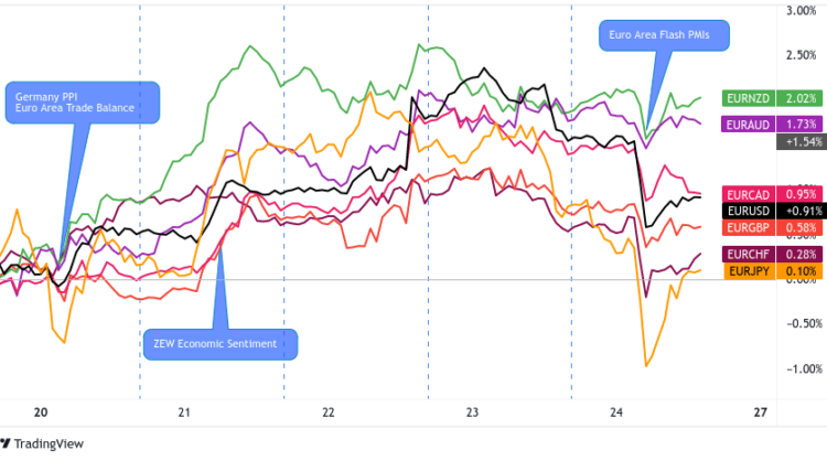 EUR, which was extending a downtrend from the previous day, spiked higher at the PMI releases. The reports also helped EUR find an intraweek bottom against counterparts like JPY, AUD, NZD, and GBP.