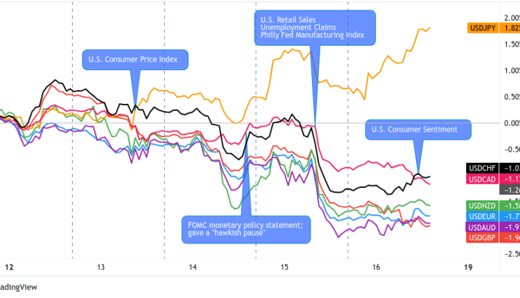 The “hawkish pause” bumped USD higher in the first 15 minutes of the release. A bit of profit-taking dragged it to at least 50% pullbacks before ending the day near its intraday highs.