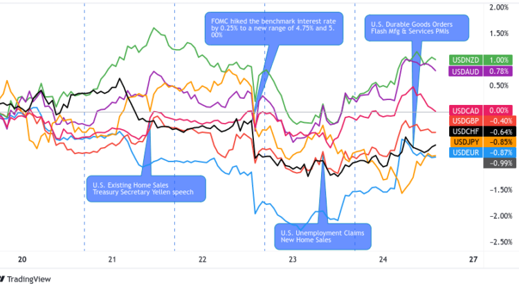 If the interst rate announcement and following press conference turns out to be a non-event, then other market themes (ex: debt ceiling, bank sector woes, geopolitical concerns) and/or counter currency stories could take the front seat to drive USD’s intraweek prices.