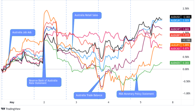 Action / results: AUD was trading inside its U.S. session ranges when the RBA surprised forex traders with a 25-basis point interest rate hike to 3.85% in May.