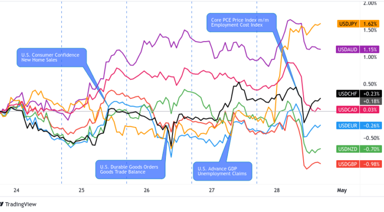 The U.S. dollar, which had gained pips after an earlier BOJ announcement and ahead of the core PCE release, dropped across the board at the prospect of the Fed raising its interest rates further despite rising recession odds.