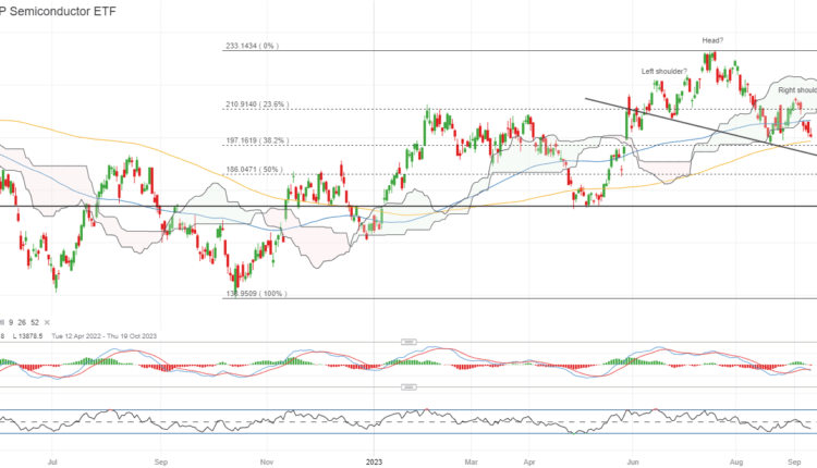 The US dollar is little changed into today’s session, while US equity futures tread on their usual wait-and-see. Perhaps one to watch ahead may be the SPDR S&P Semiconductor ETF, which seems to display a potential head-and-shoulder pattern in formation. The neckline support at the 193.00 level may be crucial for buyers to defend, failing to do so may potentially pave the way to retest its May 2023 bottom at the 174.00 level next. Its weekly relative strength index (RSI) is currently back at its neutral 50 level, which may suggest a point of reckoning ahead.