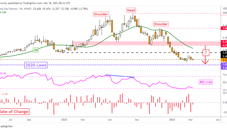Natural gas prices fell 3.8% last week, but if you measure from the high, it was closer to 12.5% as the heating commodity reversed intra-week gains. This price action continues to follow the broader bearish trajectory implied by the Head & Shoulders chart formation from late 2022. Looking back, natural gas was consolidating around the March 2021 low at 2.422. That has generally been the case since prices reached this point back in late January. Let us take a closer look at the daily and 4-hour charts to see what this week’s technical outlook looks like.