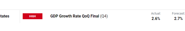 The final version of US GDP for the fourth quarter of 2022 dipped slightly lower, from 2.7% to 2.6%, dropping from the Q3 print of 3.2%.