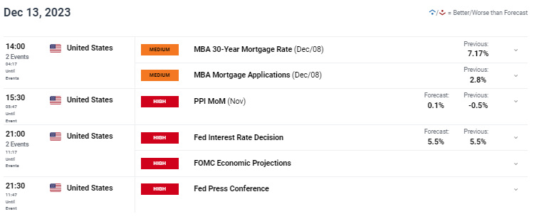 Yesterday, the Reserve Bank of Australia’s (RBA) Governor Bullock stated that policymakers would adopt a data dependent approach as we lead up to the next interest rate announcement on the 6th of February 2024. Later today (see economic calendar below), the Fed will come into focus with a likely rate pause. What will be of interest is the messaging from Fed Chair Jerome Powell and whether or not he pushed back against the revised dovish repricing. While I do not expect there to be any talk of additional rate hikes, the Governor may reiterate the need to keep monetary policy in restrictive territory for longer to continue to bring down inflation. In summary, identifying the possible start of easing as well as its size could be crucial moving forward. Currently, money markets price in 110bps of cumulative rate cuts in 2024 with the first cut occurring in May.