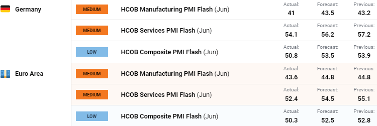 German and eurozone PMI’s significantly missed estimates (see economic calendar below) with the manufacturing sectors moving further into contractionary territory. French PMI’s released earlier showed a similar trend, heightening an economic slowdown within the region. Services data although weaker, has managed to buoy the overall EZ economy somewhat.