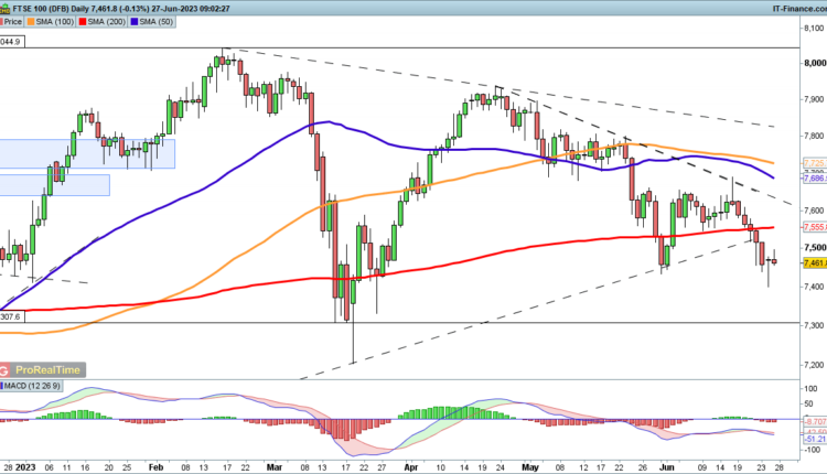 After rebounding from 7400 yesterday, the index has pushed higher and could be forming a low.Further gains above 7500 would reinforce this view, and put the price on course to target the 200-day simple moving average (SMA), and then to trendline resistance from the April highs, likely to come into play around 7600. Beyond this lies 7650, which marked the highs of late May and early June.