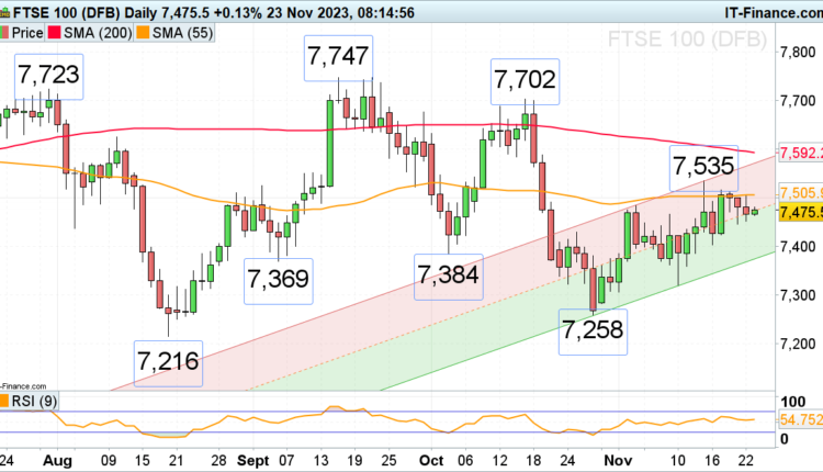 The FTSE 100 still range trades below its 55-day simple moving average (SMA) at 7,506 following the chancellor’s autumn statement which despite promising significant tax cuts leaves the UK tax burden at the highest level since 1948.