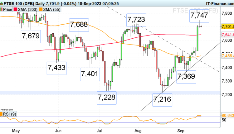 Last week the FTSE 100 had its best week in nine months as it rose by over 3%, buoyed by the rising oil price and mining stocks after China cut its reserve requirements for the second time in 2023. The UK blue chip index is expected to at least short-term consolidate below its 3 ½ month high at 7,747 as UK rental prices surge to multi-year highs while house prices stagnate and as traders await Thursday’s Bank of England (BoE) rate decision.