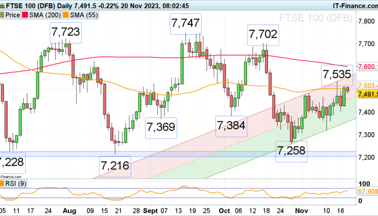 ​The 55-day simple moving average (SMA) at 7,503 may act as short-term resistance on the way up but once it and the 7,535 peak have been exceeded, the 200-day simple moving average (SMA) at 7,600 will be in focus.