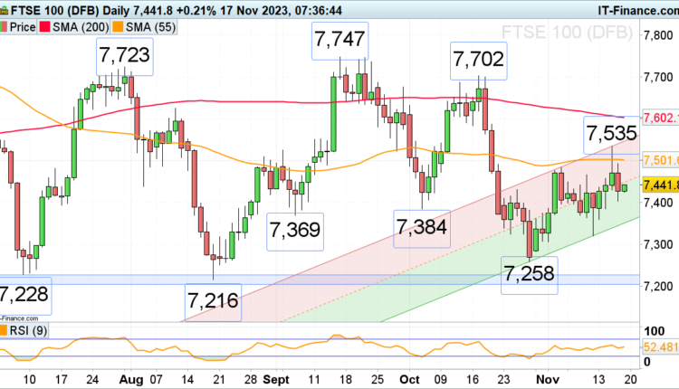 Early Friday morning UK retail sales slid to their lowest level since the 2021 COVID-19 lockdown, by 0.3% in October 2023, following a downwardly revised fall of 1.1% in September. This did not prevent the FTSE 100 from recovering from Thursday’s low at 7,403. While it holds, the 9 November high at 7,466 may be reached. Further up sits more significant resistance between the early November high and the 55-day simple moving average (SMA) at 7,484 to 7,501.