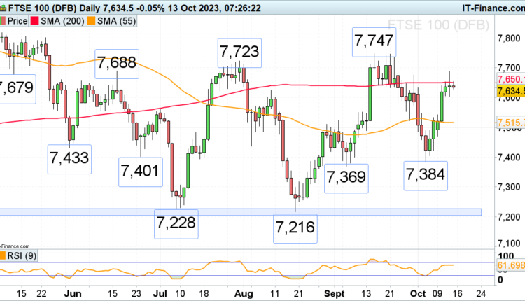 The FTSE 100 has seen six consecutive days of gains, on Thursday driven by energy and health care stocks, but has come off the 200-day simple moving average (SMA) at 7,650 as US CPI inflation came in slightly higher-than-expected and provoked a reversal lower. Further consolidation below Thursday’s high at 7,687 is expected to be seen on Friday. If a slip through Thursday’s low at 7,604 were to unfold, support between the 7,562 early July high and the 7,550 11 September high may be revisited.