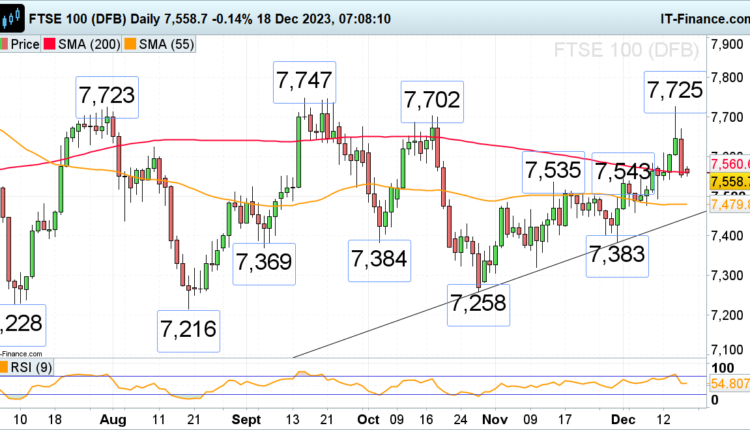 Last week the FTSE 100 briefly made a near three-month high at 7,725 before slipping back to the 200-day simple moving average (SMA) at 7,561 despite UK rates remaining on hold but as three of nine voting Bank of England (BoE) Monetary Policy Members (MPC) voted for a further rate hike.
