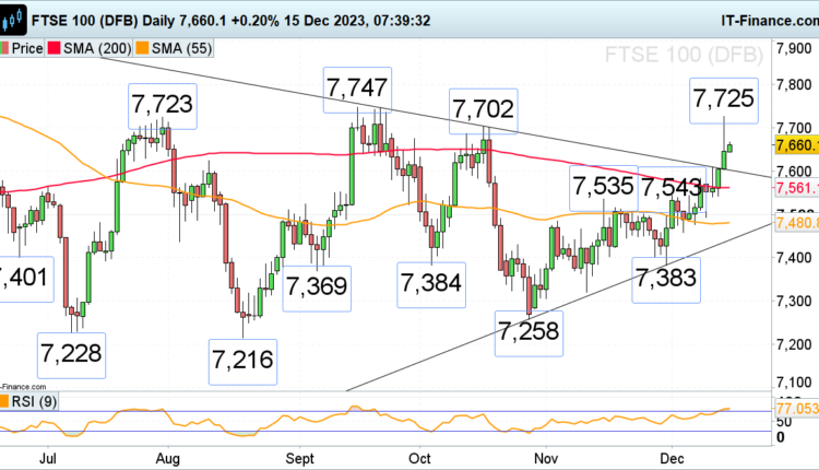 The FTSE 100 briefly made a near three-month high at 7,725 on Thursday as risk-on sentiment prevailed amid brought forward rate cut expectations in the US from May to March of next year with a total of 150 basis points of cuts priced in by the markets. Later in the day, the UK blue chip index gave back more than half of its intraday gains, though, after it became known that three of the nine voting Bank of England (BoE) Monetary Policy Members (MPC) wanted to see another rate hike while six voted to keep UK rates where they are.
