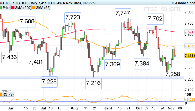 The FTSE 100 ended last week on a high and managed to rally to 7,484, close to the 55-day simple moving average (SMA) at 7,497, following softer US employment data, rapidly falling yields and rising US indices. The index begins this week around the 7,401 June low and the early September and early October lows at 7,384 to 7,369 which offer minor support. While it holds, last week’s high at 7,484 may be revisited, together with the 55-day simple moving average at 7,497 and the early September high at 7,524. If overcome in the course of this week, the 200-day simple moving average (SMA) at 7,621 would be next in line.