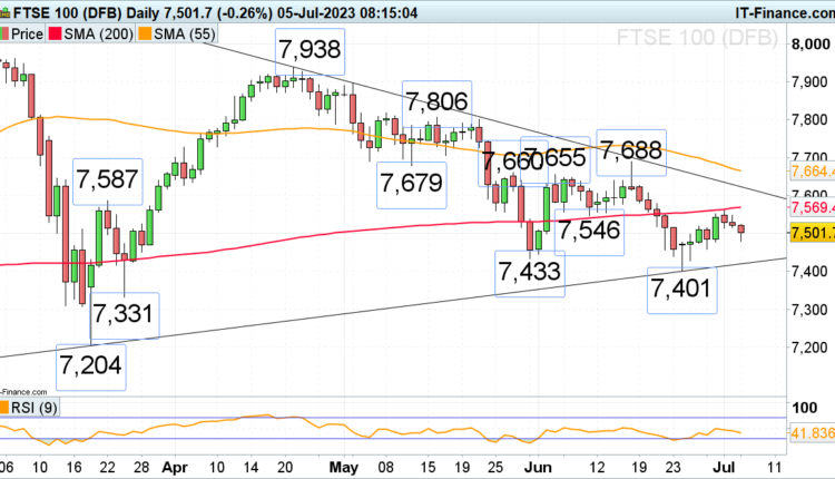 ​Resistance above Monday’s low at 7,514 can be seen along the 200-day simple moving average (SMA) and at this week’s high at 7,562 to 7,569. While it caps, the FTSE 100 should remain under pressure.