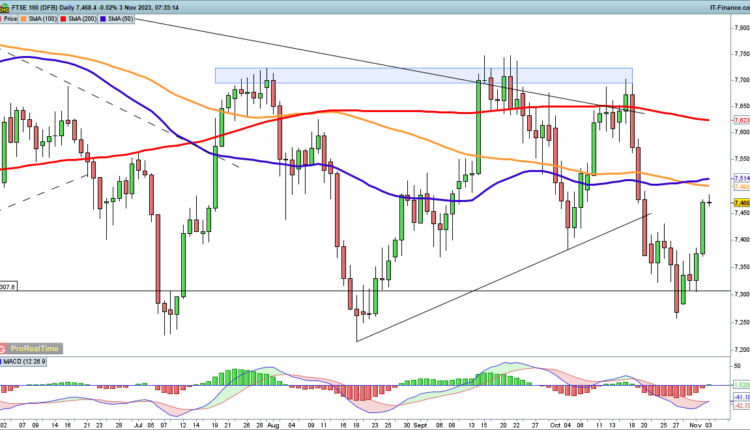 The rally off the 7300 continued on Thursday, with impressive gains for the index that have resulted in a move back through 7400. This now leaves the index on the cusp of a bullish MACD crossover, and could now see the price on course to test the 200-day SMA, and then on to 7700.
