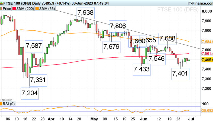 ​The UK blue chip index is trying to finish the quarter on a positive note and might revisit this week’s high at 7,518. Beyond there meanders the 200-day simple moving average (SMA) at 7,561 which is unlikely to be reached today, though. ​A drop through Thursday’s low at 7,459 would void this short-term bullish outlook and instead, point to the 7,433 May low being back in sight.