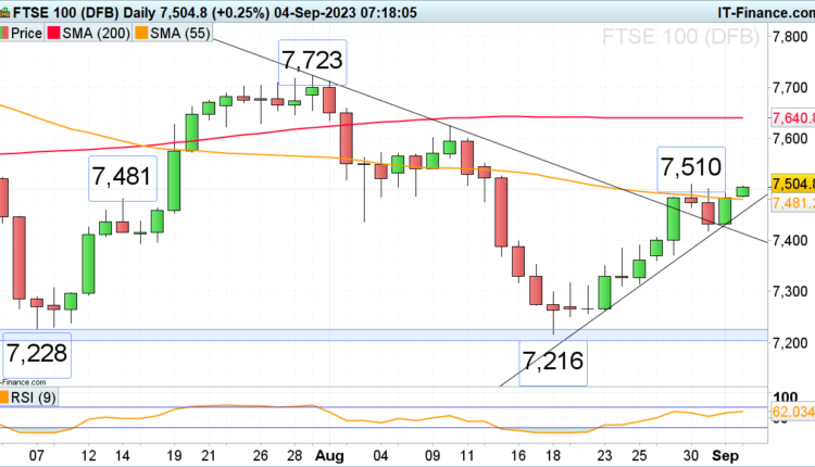 While the 55-day simple moving average (SMA) at 7,307 holds, the 24 August high at 7,345 may be revisited ahead of the August-to-September downtrend line at 7,392. For this short-term bullish scenario to play out, Friday’s low at 7,286 will need to hold, though. Should it not, the late July low at 7,251 may be revisited.
