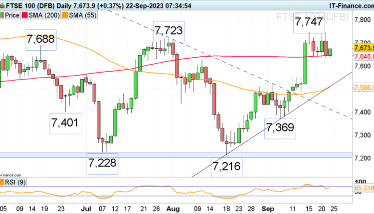 On Friday morning the FTSE 100 bounced off the moving average and headed towards the 7,688 June high. If bettered, the 7,723 July peak and at last week’s 7,747 high would be back in sight. These highs will need to be overcome for the psychological 7,800 mark and the 7,817 8 May high to be back in play.