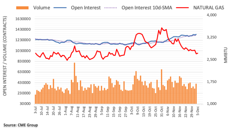 Prices of natural gas started the new trading week on the back foot amidst increasing open interest and volume. That said, further decline carries the potential to drag the commodity to the key 200-day SMA around the $2.620 region per MMBtu.